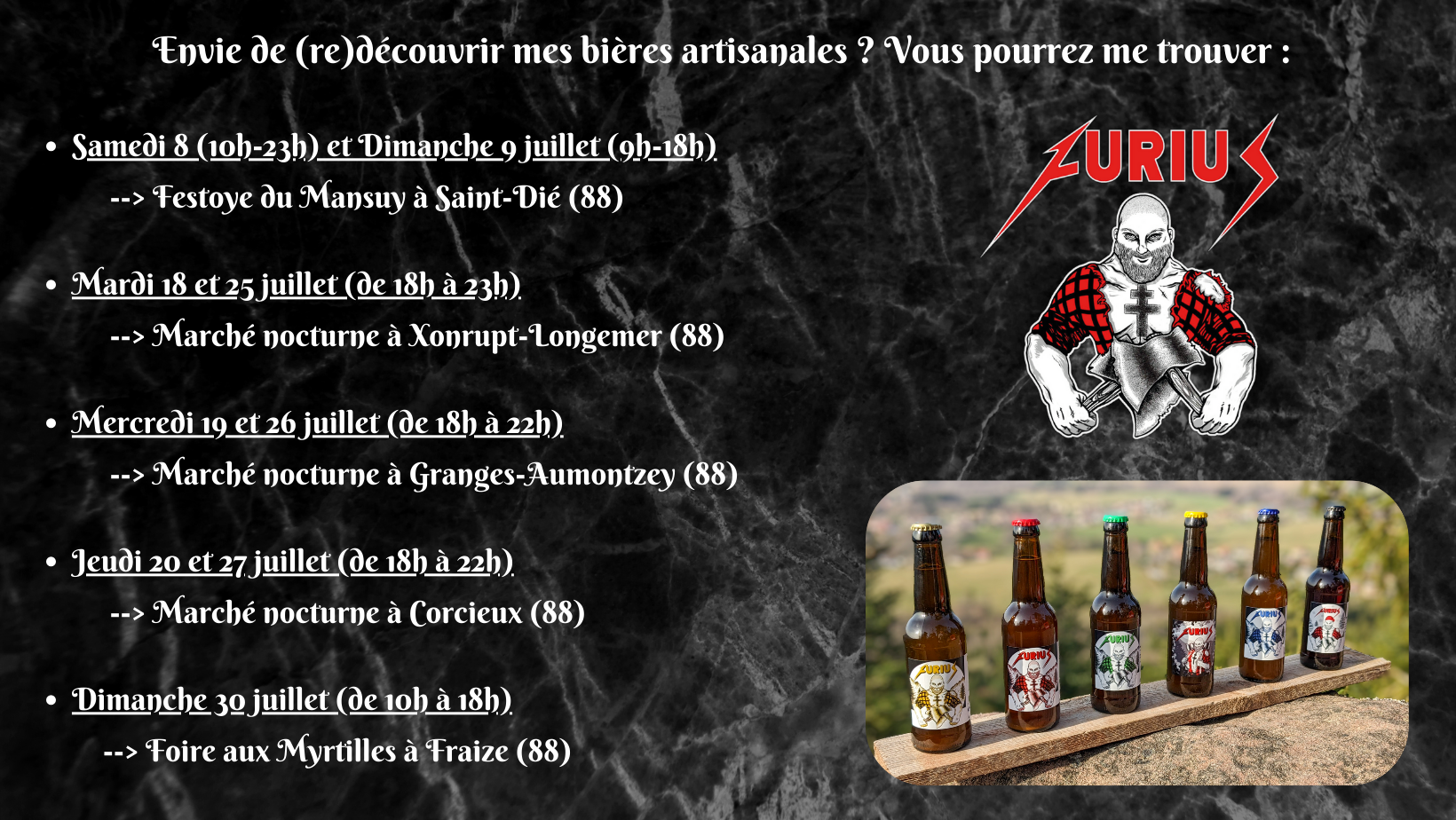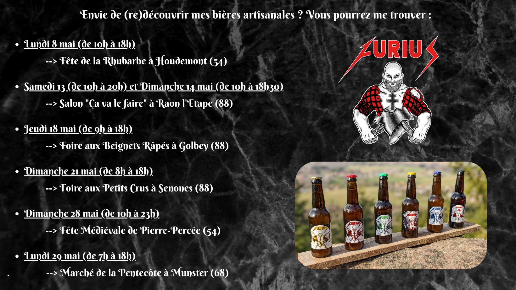 Voici les différentes dates où vous pourrez venir déguster mes bières ?